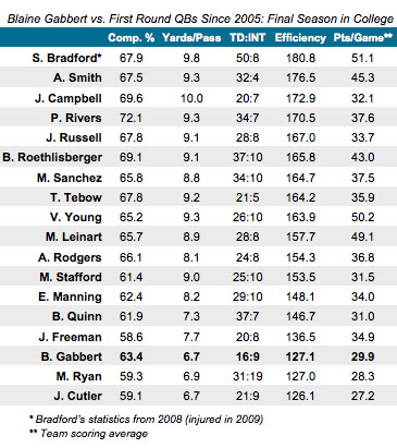 He generated no Heisman buzz, didn't get a sniff from the postseason All-America teams, doesn't own a single school passing record. Big 12 coaches thought he was no better than the third-best quarterback in the conference last year, behind at least Oklahoma State's Brandon Weeden and Baylor's Robert Griffin. He didn't stretch defenses downfield to any notable degree. Statistically, he ranked seventh among regular Big 12 starters in completion percentage, eighth in yards per attempt, eighth in touchdown:interception ratio and eighth in pass efficiency rating, the most important number in the game aside from the scoreboard. (Gabbert's efficiency rating was 64th nationally. Compare that to the other certain top-10 quarterback in this draft class, Cam Newton, who finished second nationally with one of the most efficient seasons in college history, besides emerging as one of the nation's most unstoppable runners and best fourth-quarter rally-maker.)
